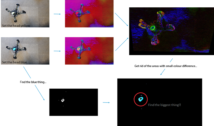 - Tracking then involves “following the blue thing”, with some classification to check the position and shape of the object is correct.